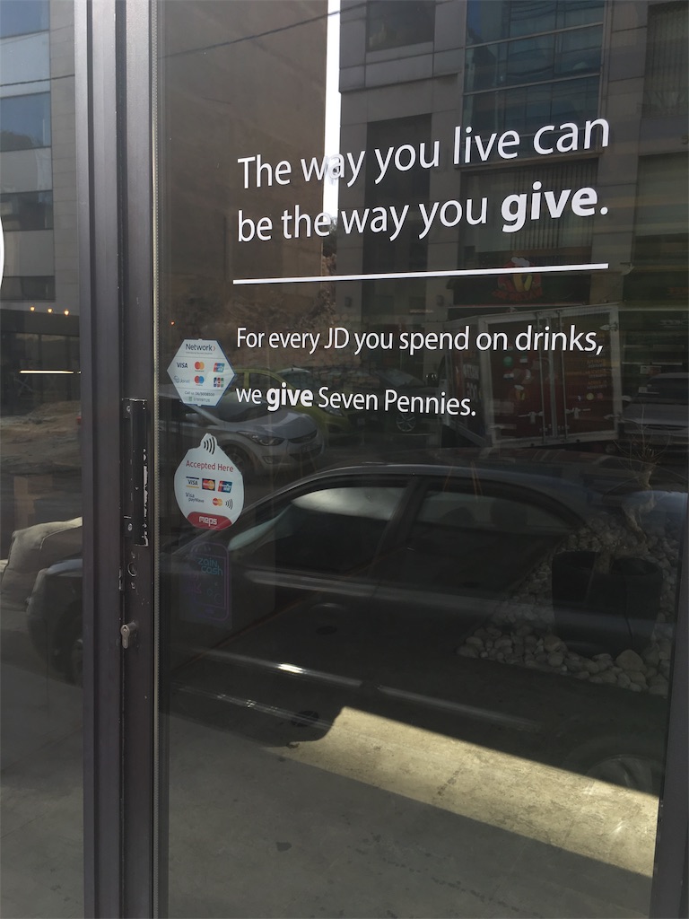 7th circle近くのおしゃれカフェ。Abdounにも支店ができたそうです。売上の一部が寄付される仕組みなど、普通のカフェよりちょっとこだわりがありそう。それもあってか、アンマンの多くのおしゃれカフェ同様、お値段はやや高めです。